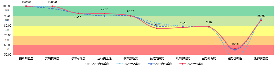 城市轨道交通服务指数涵盖“服务可靠度、乘车舒适度、轨道-公交融合度、轨道-慢行融合度、乘客满意度”等9项指标。2024年第四季度城市轨道交通服务指数测评结果为91.37分,环比上升0.24分,整体服务水平“优秀”。