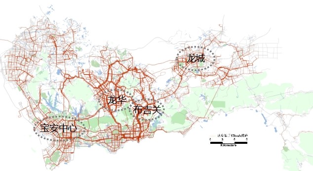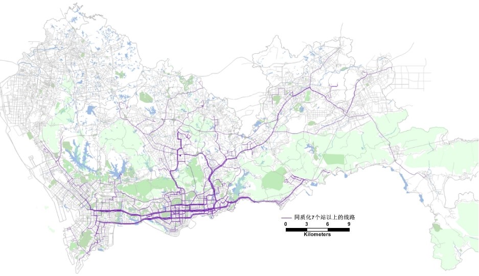 图4 深圳市与轨道并线超过(含)7个站点的公交线路分布图