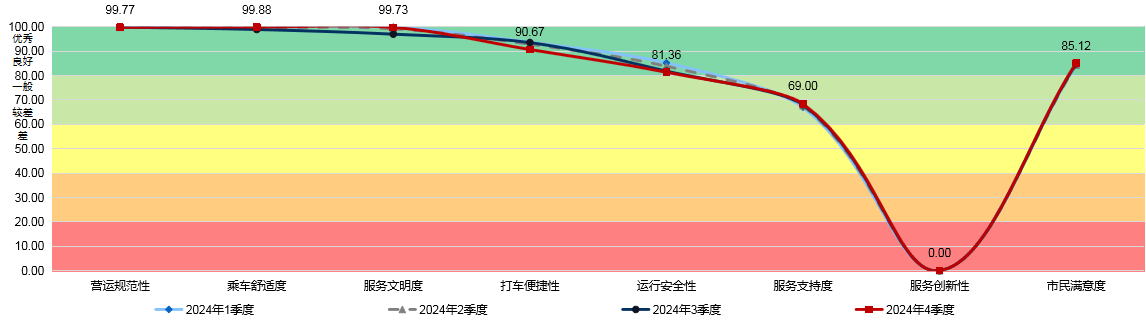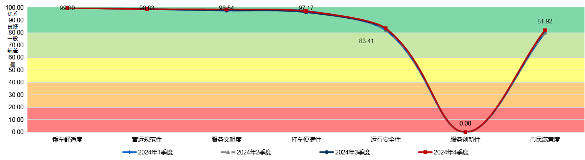 出租车服务指数包括巡游出租车和网约出租车两类,涵盖了“打车便捷性、运行安全性、营运规范性、乘客满意度”等8项指标。2024年第四季度出租车服务指数测评得分为82.02分,环比上升0.44分。其中,巡游出租车与网约出租车服务指数测评得分分别为82.04分、82.01分,测评结果均为“良好”。