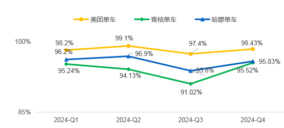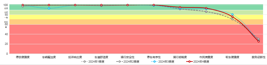 共享单车服务指数涵盖“车辆整洁度、停车有序性、骑行顺度、乘客满意度”等10项指标。2024年第四季度共享单车服务指数测评结果为89.48分,环比上升1.36分,测评结果为“良好”。