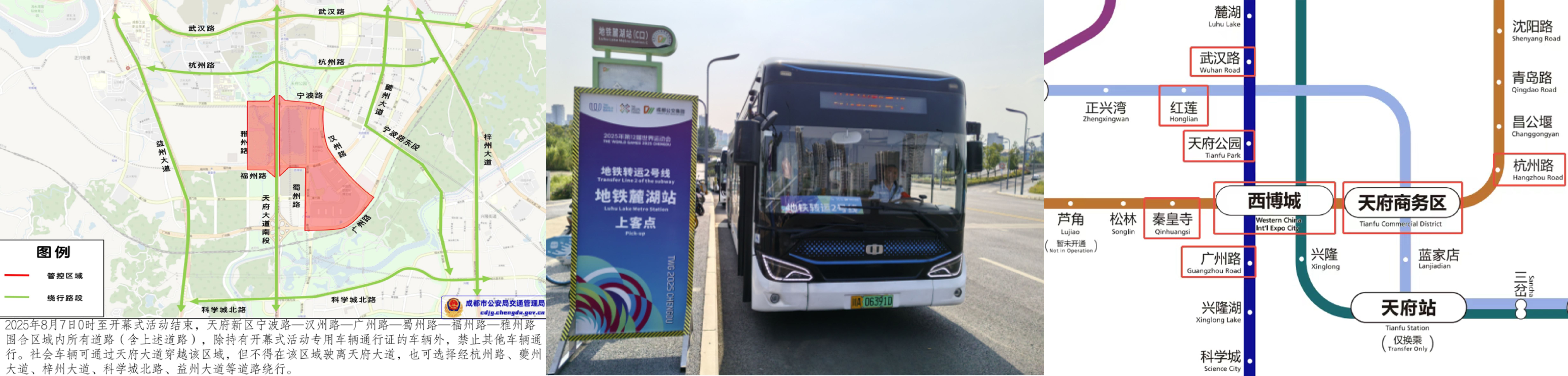 图4:城市侧交通临时管控及调整(图分别源自成都交警、成都公交、成都地铁)
