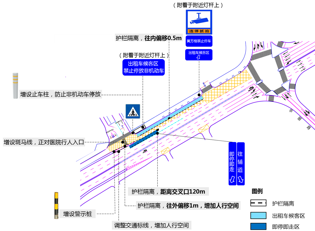 对症药3:优化设施。协调保健办道闸后退15米,防止车辆排队致堵;在医院门口设置乘车区,并用护栏隔离,防止非机动车停放;增设斑马线和雨棚,为乘客提供良好的候车环境。这些细节的优化,让交通出行更加便捷、舒适!