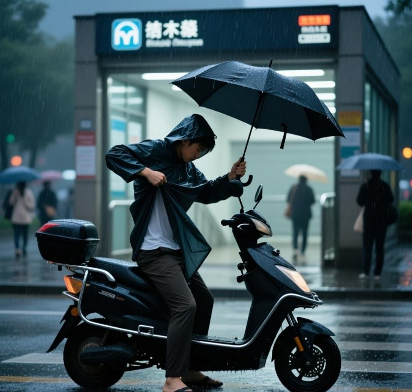 市民贾先生反映:“每次下雨天,骑电单车到了地铁口,停好电单车后,脱下雨衣换雨伞的瞬间总是不可避免淋湿衣服,而为了上班不迟到,只能狼狈地穿着湿衣服挤进地铁车厢,再经车厢充足的冷气吹一路,太容易着凉感冒了。”