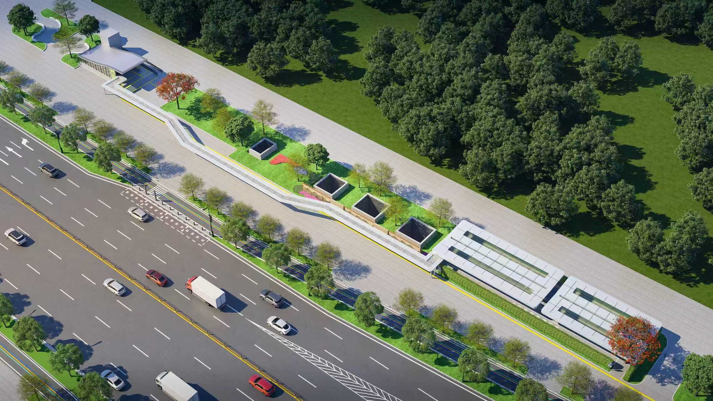 坝头站位于龙湾片区、鸿福西路西端,可以说是万江的门户站。同时,鸿福西路是东莞市“一心两轴三片区”中鸿福路山水文化轴的重要组成部分,是“黄金双轴”的公共服务带、彰显山水的形象展示带,其景观、建筑等标准较高。我院提出在坝头站设置集中式非机动车停放区,并配套充电设施及雨棚,我院坚持“实用>耐看>有特色、简洁大方低维护”的设计原则,深化设计非机动车接驳方案,确保雨棚落地可实施性,方案获得了东莞市政府的批准。目前,万江街道辖区内3个站点的接驳设施正在实施。